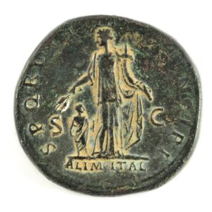 Au revers, la légende ALIM ITAL (Alimenta Italiae) en exergue fait référence à un système d’assistance publique pensé par Nerva (96-98 apr. J.-.) et mis en place dans de nombreuses cités italiennes – à l’exception de Rome qui a ses frumentationes -, sous Trajan (98-117), consistant à prêter de l’argent à des propriétaires fonciers hypothéquant leurs terres. Les intérêts versés servaient au payement de pensions alimentaires destinées à l’enfance défavorisée.