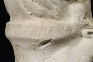 A l’arrière du rocher figure une inscription de lecture incertaine, répartie sur deux lignes. La première partie, située en bordure du siège, mentionne le nom du potier qui a modelé la statuette. Seules les lettres ICVS FIICIT ([ ]icus a fait) sont encore lisibles (Atticus ?). En-dessous de la signature, dans la partie concave du rocher, se trouve la fin de l’inscription qui pourrait correspondre aux lettres C.C.A.A., initiales de l’antique cité de Cologne.