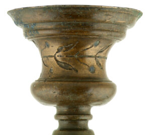 Le candélabre se compose d’un fût cylindrique cannelé qui se fixait à l’origine sur un trépied qui n’est pas conservé. L’extrémité supérieure du fût est ornée d’une série de moulures surmontées d’un calice évasé décoré de motifs végétaux. Ce dernier était couronné d’un plateau porte-lampe présentant une frise d’oves en bordure et orné en son centre d’une rosace en relief. Des modèles de candélabres similaires, vraisemblablement produits en Campanie, ont été découverts à Herculanum et à Pompéi.
